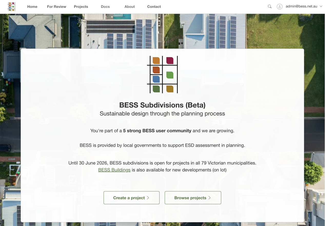 BESS Subdivisions can be used to create projects in all Victorian councils during the beta period. Use your existing BESS account to access BESS Subdivisions at https://bess.net.au/subdivisions/ (opens new window)